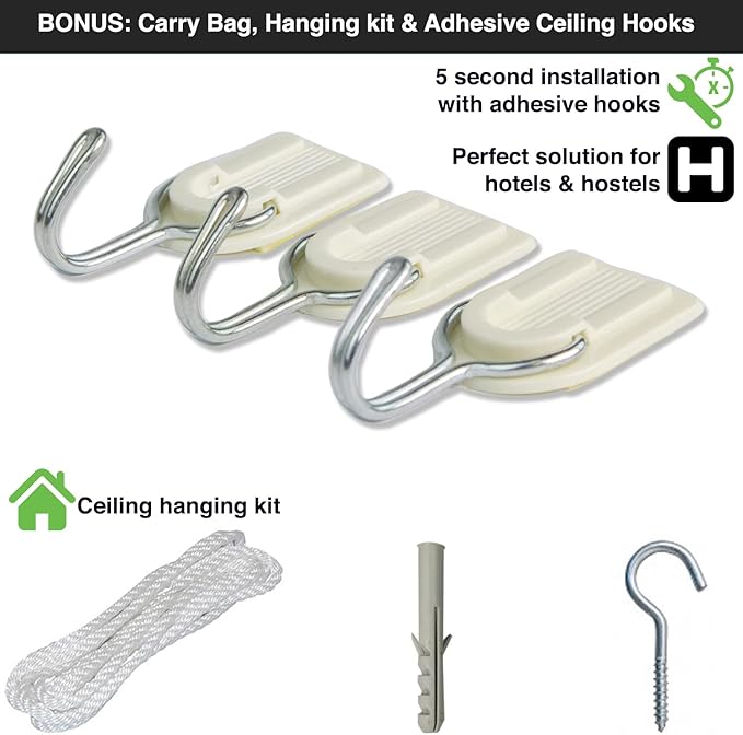 • LIGHTWEIGHT & EASY SETUP! The net weighs just 0.8 lb and can easily be set up with only one attachment point. A compact carrying bag, hanging kit and self-adhesive ceiling hooks are included.