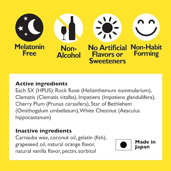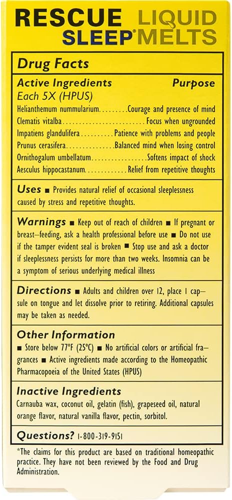 - Includes (1) Bach Rescue Sleep Liquid Melts: Homeopathic flower essence blend. Natural orange vanilla flavored quick-dissolve capsules. To help ease stress and calm busy, repetitive thoughts. Melatonin-free