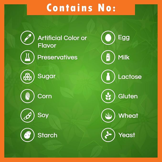 - No Artificial Color, Flavor, or Sweetener, No Preservatives, No Sugar, No Milk, No Corn, No Soy, No Egg, No Lactose, No Gluten, No Wheat, No Yeast, No Fish. Sodium Free.