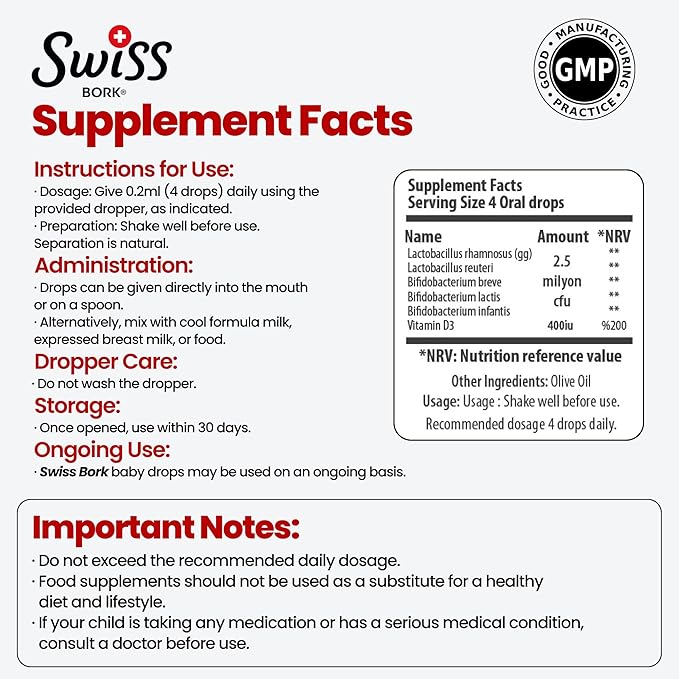- SWISS BORK Baby Probiotic Drops with Vitamin D3 — Kids Probiotics for Gut Health, Effective Digestive Support, and Colic Relief – 10ML & 45 Days’ Supply (Halal)