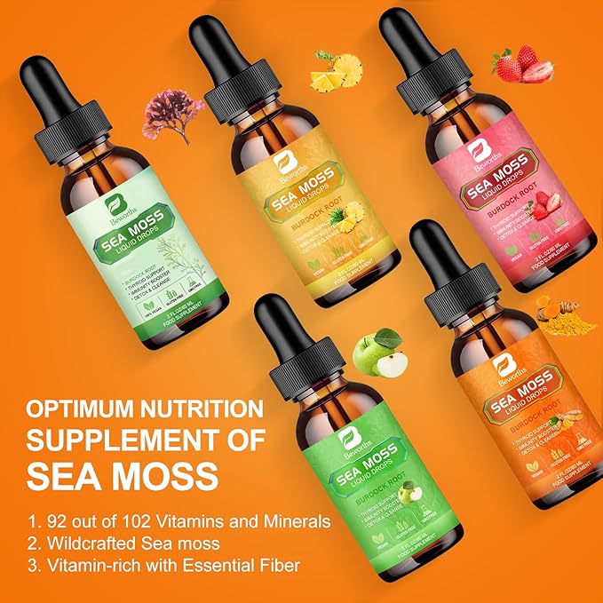 - 【Nutrient Vitamin-rich Sea Moss Liquid Drops】: Sea moss drops include the ingredients Irish sea moss, bladderwrack, burdock root, fruits pineapple, and spirulina powder. Our organic sea moss gel drops supplement is packed with 92-102 vitamins and minerals, and nutrients essential to daily health including zinc, fiber, calcium, potassium, iodine, iron, sodium, and other valuable additions.