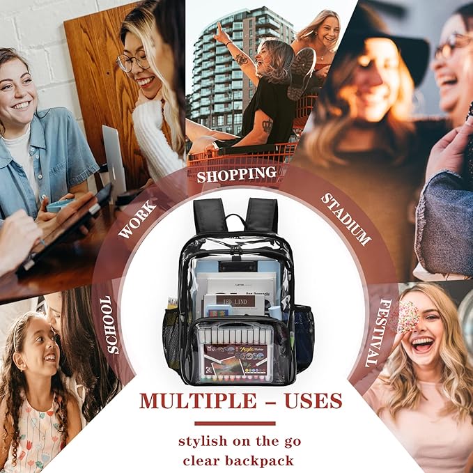 • Multiple Uses - Lightweight transparent backpack Can be used in different occasions, for work, stadium, library, museum, short trip, sporting, picnic, concert and carnivals etc; fully meet your daily needs