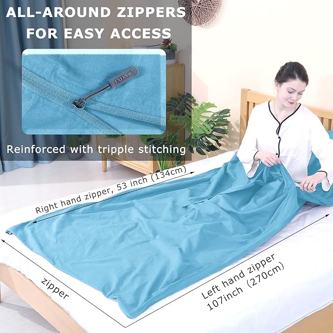 • This XL sleeping sheet provide you with comfort when traveling. It’s wide (87x43 inches) and allows you to turn inside it without being twisted. Full-length zippers run along left, right side and also the bottom of the sheet, which enables you to get in and out of easily from any side of your bed, stretch your feet out of the bag for comfort. This multifunctional sleep sack also turns into one giant cotton bed sheet (87X88 inches) when fully unzipped. The pocket keeps your pillow in place.