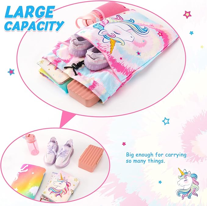 - UNICORN PATTERN:No girls would say ”no” to a unicorn with magic colorful hair and fantasy tie-dye world. Let the lucky unicorn string bag go out with your kids and free up your hands