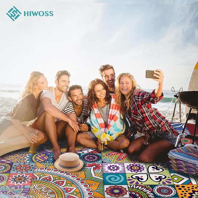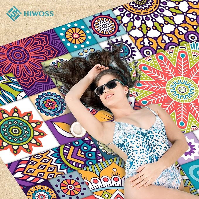 - 【UNIQUE DESIGN, 4 CORNER POCKETS】The eye-catching designed beach blanket, with quality in appearance, will make you stand out on the beach! You can easily find your family and friends on the beach without worrying about getting lost. At the same time, the beach mat is designed with four built-in corner pockets that prevent the blanket from blowing away.