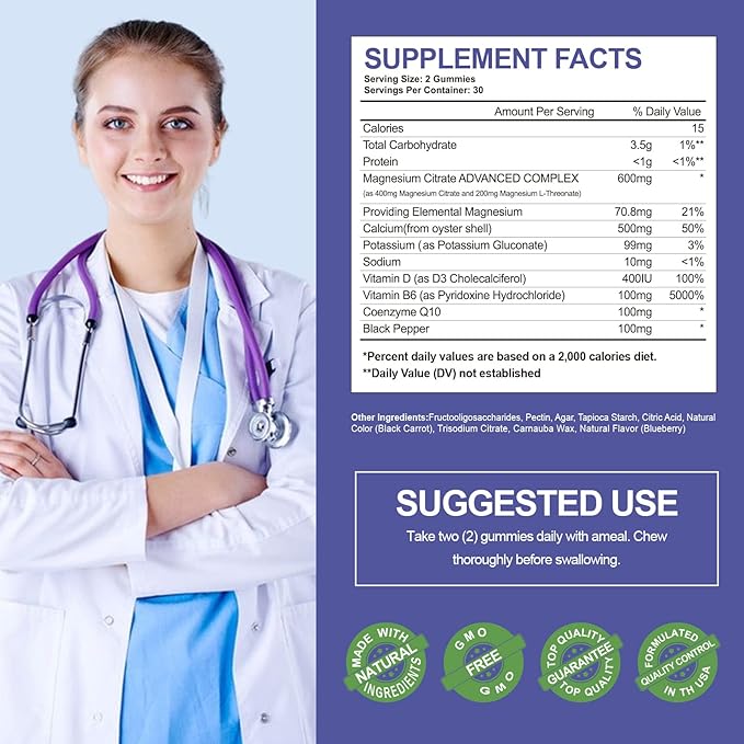 • 10-In-1 Innovative Formula, Naturally Effective : Our Potassium Magnesium Gummies Are Made From A Variety Of Premium Ingredients Including Potassium Citrate 99mg,Magnesium Citrate 400mg,Calcium 500mg,Coenzyme Q10 100mg And Black Pepper 100mg.Each Serving Of Delicious Blueberry-Flavored Gummy Also Contains Vitamin D, B6. High Absorption Magnesium Citrate Gummies Provide Magnesium To Help Relax The Body.
