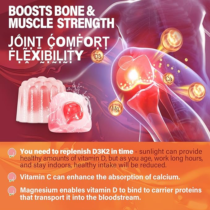 - 💗Preventing Calcium Accumulation in Ḁṛṭḙṛḭḙs: Combining K2 and D3 is a romance for the hearttt and provides numerous synergistic effects. D3 helps with the absorption of calcium into the blo0d stream, where K2 helps the body transfer calcium out of the blo❤d and into bone to preventing the buildup of calcium in ḁṛṭḙṛḭḙs, help to maintain healthy supple ḁṛṭḙṛḭḙs. Our d3k2 yummy gummies make with peach juice, coming with floral undertones and taste sweet.