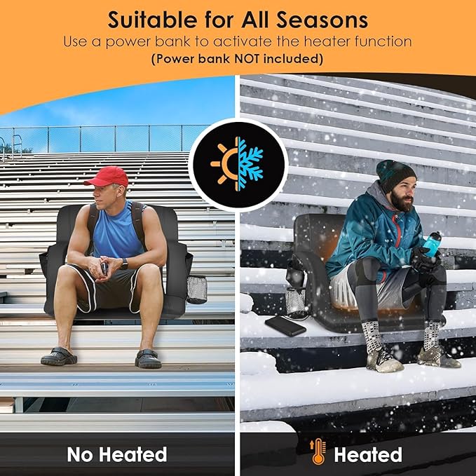 - ๐๐ฎ๐ฌ๐ญ๐จ๐ฆ๐ข๐ณ๐๐ ๐๐จ๐ฆ๐๐จ๐ซ๐ญ: Our heated stadium seats for bleachers with Newest Dual-zone Controlled Heating System, it allows you to adjust the temperature of the backrest and seat cushion independently, offering flexibility and energy efficiency. Experience hours of soothing heat using a USB power bank and stay cozy even in chilly weather. Choose from 3 heat levels (high, mid, low) and reach a max temp of 130ยฐF. Please NOTE: Power Bank NOT included.