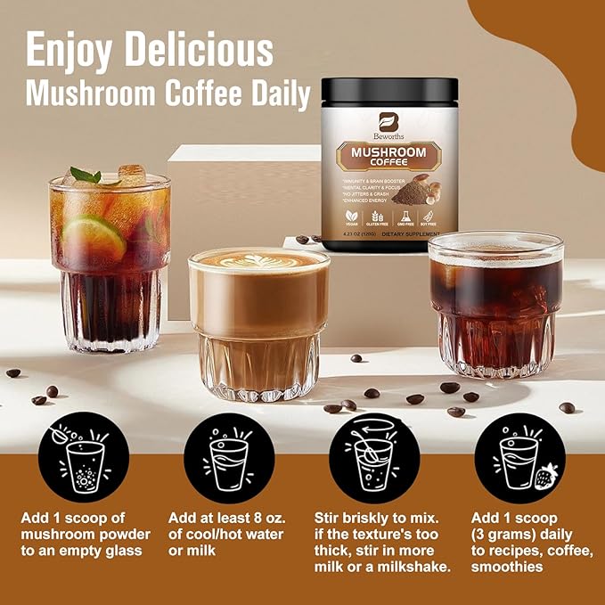 - 【HOW TO ENJOY MUSHROOM COFFEE】--Mix 3g with 6.76oz (200mL) of hot or cold water, or blend into smoothies, milk, or your favorite beverages and stir until fully dissolved. Adjust to your taste for a delicious, mushroom coffee alternative that fits seamlessly into your daily routine. We formulate our products with premium, scientifically-supported ingredients to deliver optimal wellness in every serving for 40 Convenient Servings - Supports Your Daily Wellness Routine.