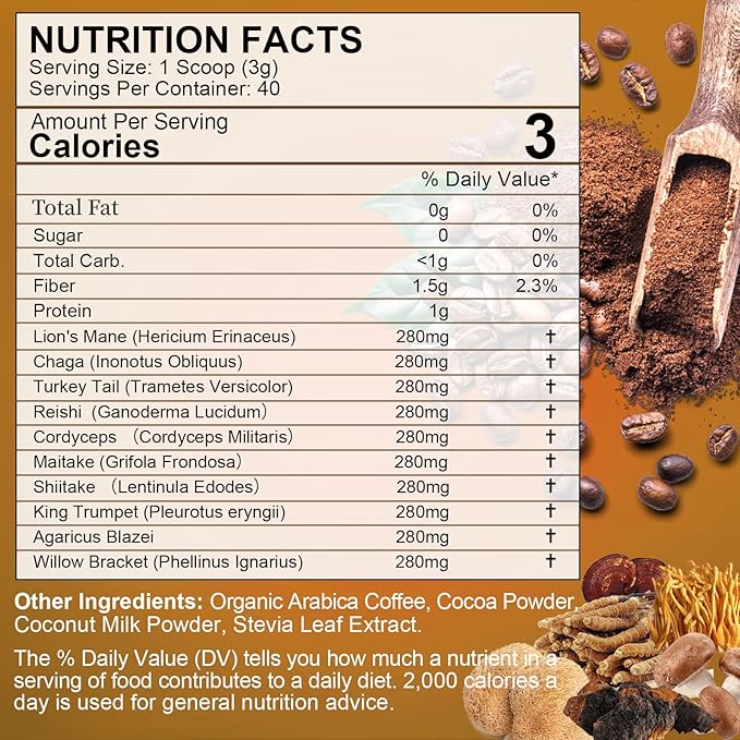 - 【10-IN-1 MUSHROOM POWDER】: Our mushroom coffee powder blend contains 10 premium blend mixes of ingredients such as Lion's mane, Reishi, Cordyceps, Turkey tail mushroom, Chaga, Maitake, Shiitake Mushroom, King Trumpet, Agaricus Blazei, and Willow Bracket. Lions Mane mushrooms powder has lots of nutrients for health, you will find lots of vitamins, calcium, and potassium. Mushroom powder coffee alternative is non-GMO, gluten-free ingredients.