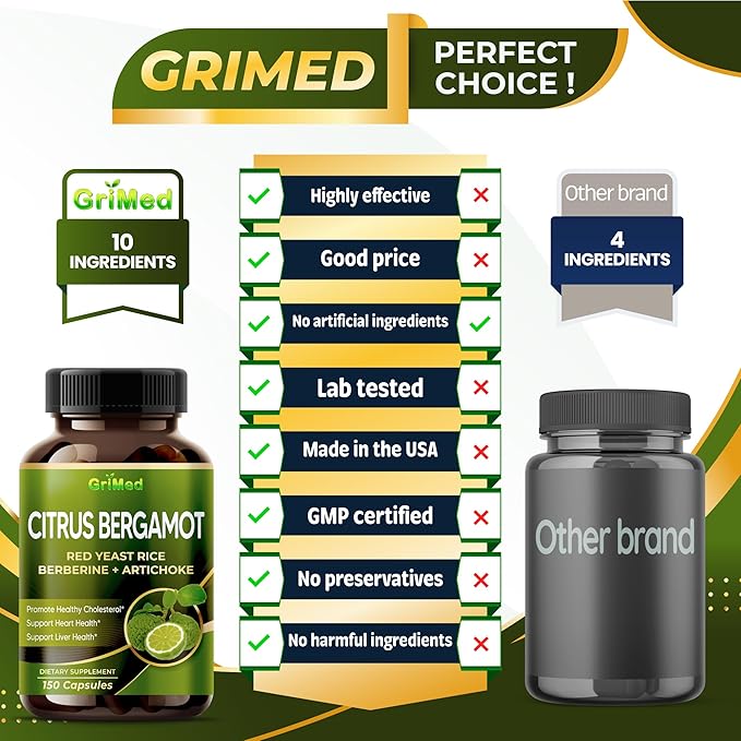 - Perfect combination: The formula of GriMed Citrus Bergamot has been developed based on scientific research and undergone numerous tests to ensure its effectiveness before being released to the market. These powerful ingredients include Niacin, Citrus Bergamot, Red Yeast Rice, Odorless Garlic, Artichoke, Berberine, Psyllium, Fenugreek, Hibiscus, and Black Pepper. All ingredients are processed in the correct proportions to maximize their quality for your benefit.