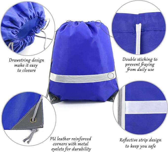 - 【STURDY & EXTRA REFLECTIVE STRIP】-- The bags are very sturdy and withstands daily wear and tear. Double stitches for all seams, making the bag is not easy to fall off and can last long. Our drawstring bags have PU leather reinforced corners, durable drawstring cords, and metal eyelets. These designs ensure that our drawstring bag is more durable. Also, the extra reflective strip can enhance the high visibility to ensure your safety while outdoor in the dark or dusk.