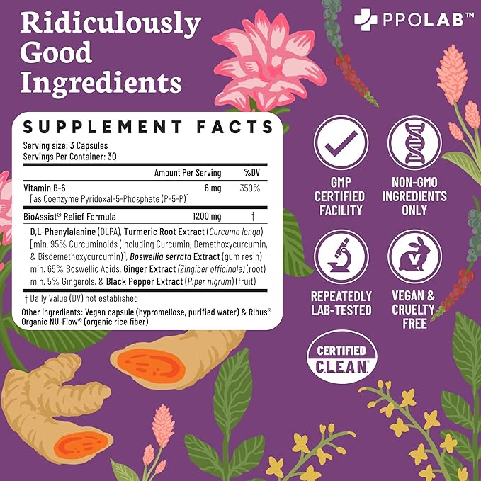 • ๐—ง๐—ต๐—ฒ๐—ฟ๐—ฎ๐—ฝ๐—ฒ๐˜‚๐˜๐—ถ๐—ฐ ๐—š๐—ฟ๐—ฎ๐—ฑ๐—ฒ : Extra Strength Turmeric Root Standardized to 95% Curcuminoid Extract, Boswellia (Frankincense) Tree Resin Extract, Ginger Root Standardized to 5% Gingerols, Black Pepper Pepper Fruit Extract, DL-Phenylalanine, & Coenzyme B6 P-5-P.*
