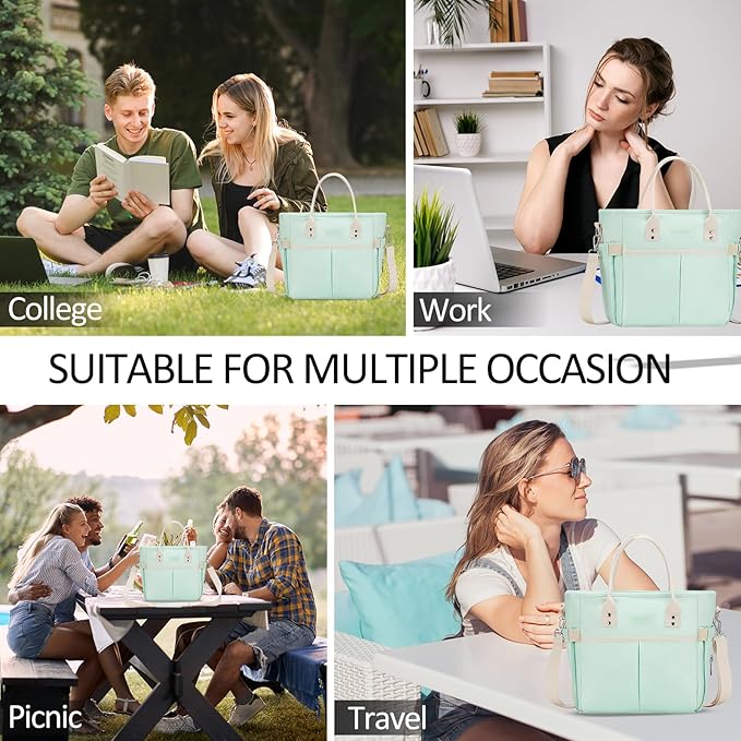 • 【Multifunctional Pockets】- There are 4 pockets on the outside for organizing your personal belongings,making this bag not only a lunch box but also a work bag. Zippered back pocket for cash, cell phone, credit cards,driver's license,etc.Front pocket for iPad, kindle,water bottle,knife and fork.Two side pockets can hold water bottles,umbrellas,napkins.It is an ideal handbag for student,women,work,picnic,and can be used as a cooler bag,diaper bag,grocery bag,etc.