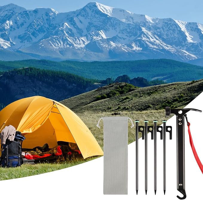 - 【Camping Accessories】Kit includes: 1*Lightweight camping hammer (12in,0.84lb) 4*heavy duty iron tent stakes(10in, 0.51lbs)4*Multi-functional floor nail fluorescent ring comes with an individual collection bag, which will be packed in a box