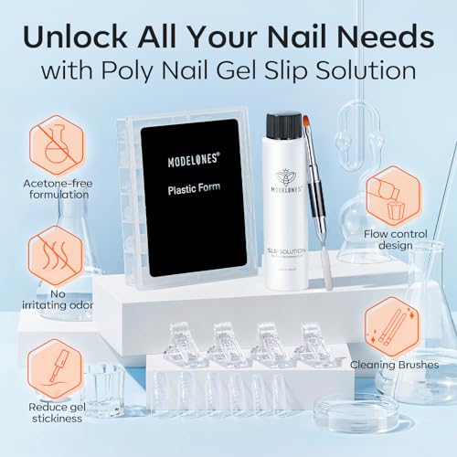 - What You Get: Modelones slip solution kit for poly nail gel includes a 2.7 oz slip solution anti-stick gel nail liquid, 120 pcs dual nail forms in 12 sizes, 6 pcs nail tips clips, a dual-ended nail brush & picker, and a crystal cup. One kit for all your needs for poly nail extension tools