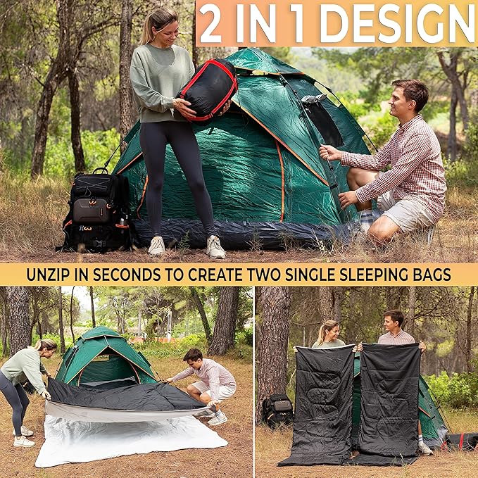 - Dual Size: The sleeping bag is large in size same with a queen size bed but can also be easily converted into two single sleeping bags. Also comes with 2 pillows for added comfort, helping you get an incredible night's rest any place you might be