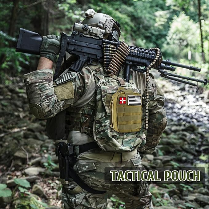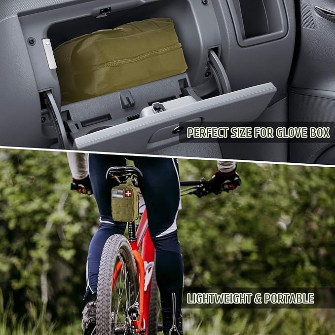 - 【Compatible and Portable】 The military grade MOLLE medical pouch is made of 1000D nylon, which is lightweight and waterproof. Inside the bag, there are three large compartments and several straps, all survival gear and equipment are stored in an organized and easy-to-find manner, making it easy to locate necessary items in an emergency situation. The MOLLE system on the back also allows you to easily attach the kit to your tactical vest, backpack, or belt.