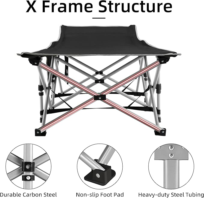 - Durable Structure & 600 Lbs Max Load: Fragess camp cot is constructed in a triangular shape and thicker steel. Each heavy duty cot leg has non-slip pads to ensure safety and stability. Folding camping cot can withstand 600 lbs, won't squeak or shake when you sleep, ideal sleeping cots for adults. Camp cot size:75 x 28 x 13.8 inch