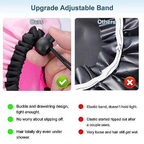 - 🛁【Unique Dual Waterproof Shower Cap - Keep Your Hair Dry】The reusable jumbo shower cap features a dual waterproof design, utilizing odor-free EVA for durability and 100% waterproofness. Moreover the edge of the waterproof hair cap for shower is reinforced with waterproof polyester to prevent water infiltration.