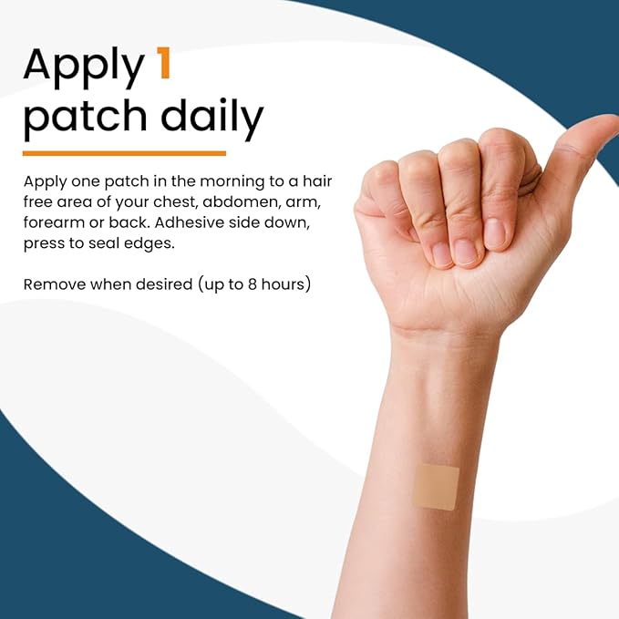 - Easy to use: Simply stick a patch daily to an area with little or no hair (shoulder, back, arms, or hip) Includes