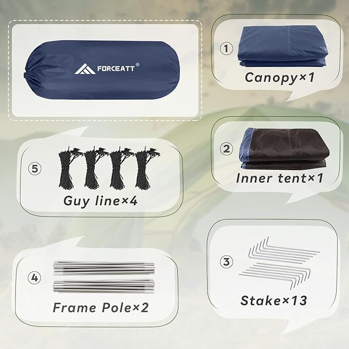 • Lightweight & Convenient: The internal size of the Forceatt camping tent is 86.6x51.1x43.3in (220x130x110cm), which can accommodate two person at the same time. At the same time, it has a package size of 41 x 14cm and weighs 5.68lb (2.58kg), which saves space and is easy to carry.