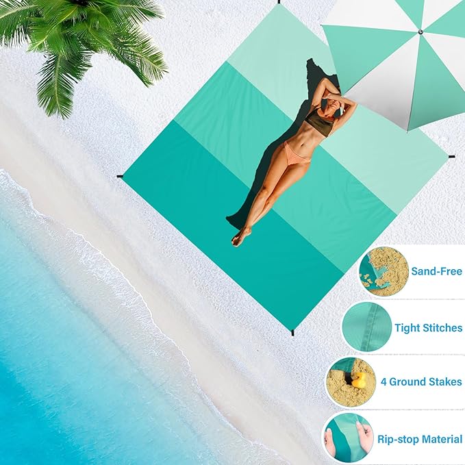 • 🏖️Beach Blanket Waterproof Sandproof:10'×9' size beach blanket, suit for 1-8 adults in total,odorless,made by parachute fabric. Rip-stop 210T polyester,light weight and small after folding. 24 oz easy to carry,small and mighty!