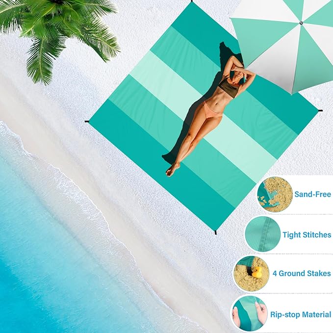 • 🏖️Beach Blanket Waterproof Sandproof:10'×9' size beach blanket, suit for 1-8 adults in total,odorless,made by parachute fabric. Rip-stop 210T polyester,light weight and small after folding. 24 oz easy to carry,small and mighty!