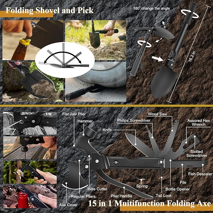 • 【High-quality Survival Gear and Equipment for Camping or Home Needs】 The survival first aid kit offers high-quality and professional tactical survival tools to ensure you will be well-prepared under any emergencies. The kit contains: 14 in 1 hatchet, folding shovel and pick, collapsible tent lantern, tactical flashlight, survival bracelet,multi-tool card, fire starter, emergency blanket, 12-hour glow stick, wire saw, and emergency rain poncho.