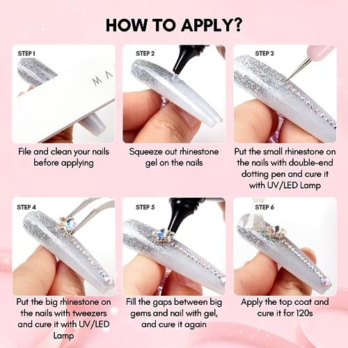 - How to Use: Apply crystal glue resin to your nail. Place rhinestones onto glue and cure for about 3 minutes using an LED lamp. For larger rhinestones, add more glue for extra security. Cure until fully dry, and your nail charms are beautifully secured