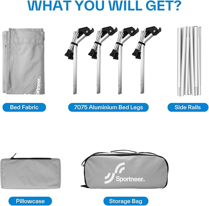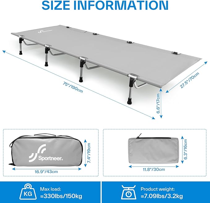 - More Sturdy & Steady: Enjoy the pinnacle of quality and comfort the Sportneer camp folding cot. The portable backpacking cot legs boast exceptional aerospace-grade 7075 aluminum alloy while the lightweight sleeping bed surface is expertly constructed tear-resistant 300D elastic polyester fabric, reinforced PU coating. This winning combination ensures unparalleled stability and durability, supporting a maximum weight of 330 pounds.