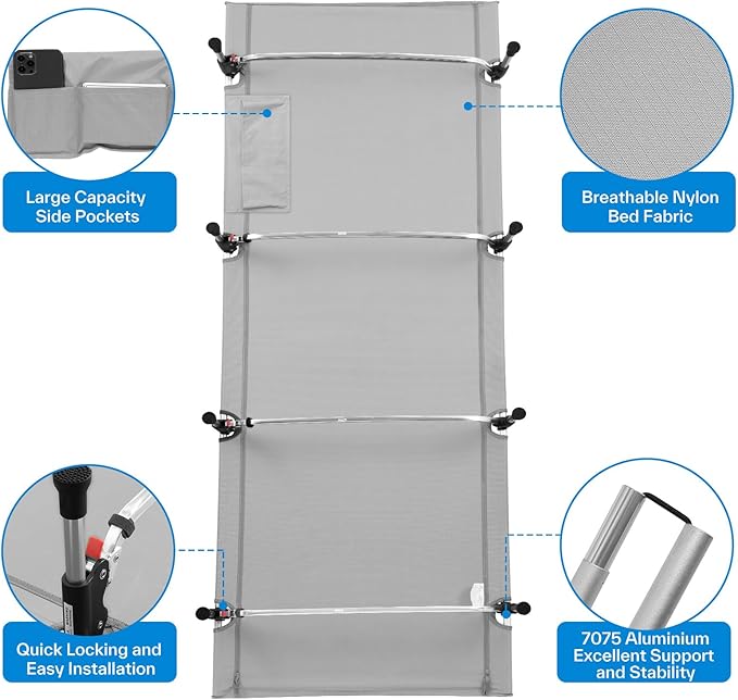 - Effortless Setup & Portability: Our innovative lever locking mechanism allows you to connect the legs and supporting bars, tighten the camping cot surface securely out sagging, and easily disassemble it by pressing the trigger structure. the included storage bag, you can easily pack the camping cots for adults away and hit the road!