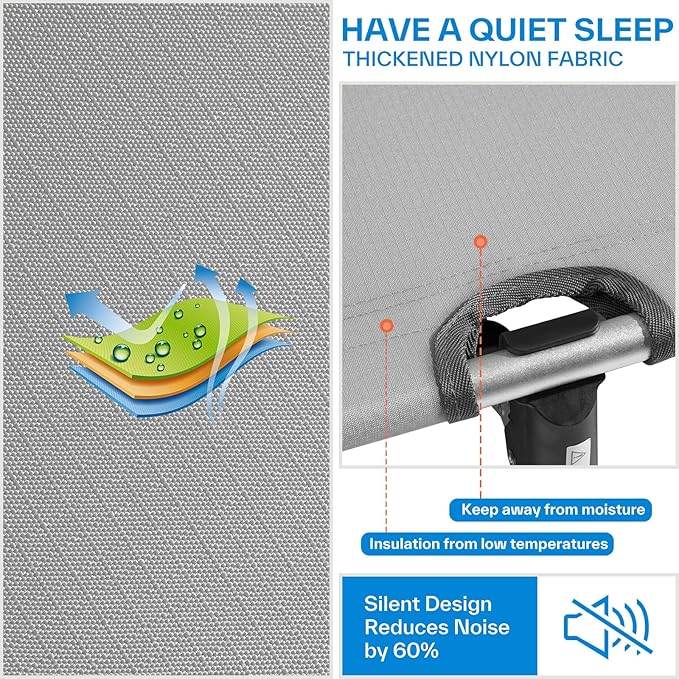 - Silence in Use: Experience a peaceful night's sleep the 74.8x27.6-inch Sportneer camping cot. Its inner mesh fabric backpacking bed surface reduces noises caused by turning over, ensuring a quiet and comfortable slumber. the ample space and whisper-quiet design, you can rest easy wherever your adventures take you.
