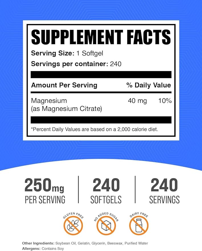 BulkSupplements.com Magnesium Citrate Softgels - Magnesium Supplement, Magnesium Citrate Supplement - 250mg (with 40mg Magnesium), Gluten Free, 1 Softgel per Serving, 240 Count (Pack of 1)