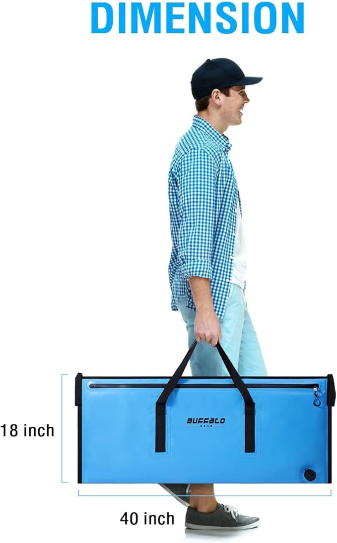 - DURABLE&CONVENIENT: The Buffalo Gear monster fish bag inner sizes:36x17inch, uses the highest quality heavy-duty materials,watertight zipper, and two strong straps. It's easy to pack on the boat instead of a big bulky cooler and takes up less space on the boat