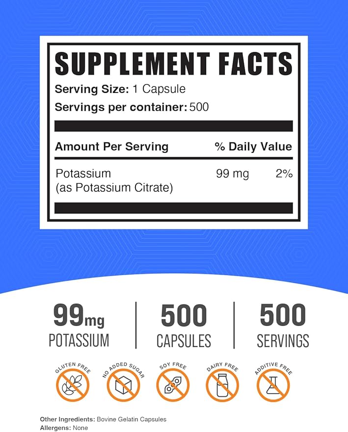 BulkSupplements.com Potassium Citrate Capsules - Potassium Citrate 99mg - 1 Capsule per Serving, 500 Capsules (Pack of 1)