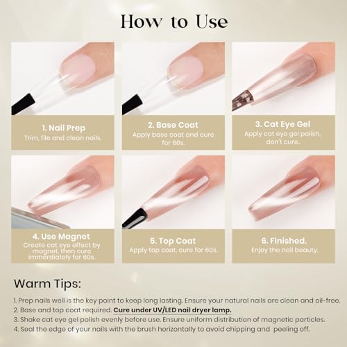 - Easy Application and Good Quality: The upgraded cat eye gel nail polish can last over 28 days with correct application. Good toughness and tinting strength bring you a brilliant shiny finish and smooth appearance. Gorgeous cat eye gel nail art set is perfect for all daily working or dating, vacations party or ceremony activity.