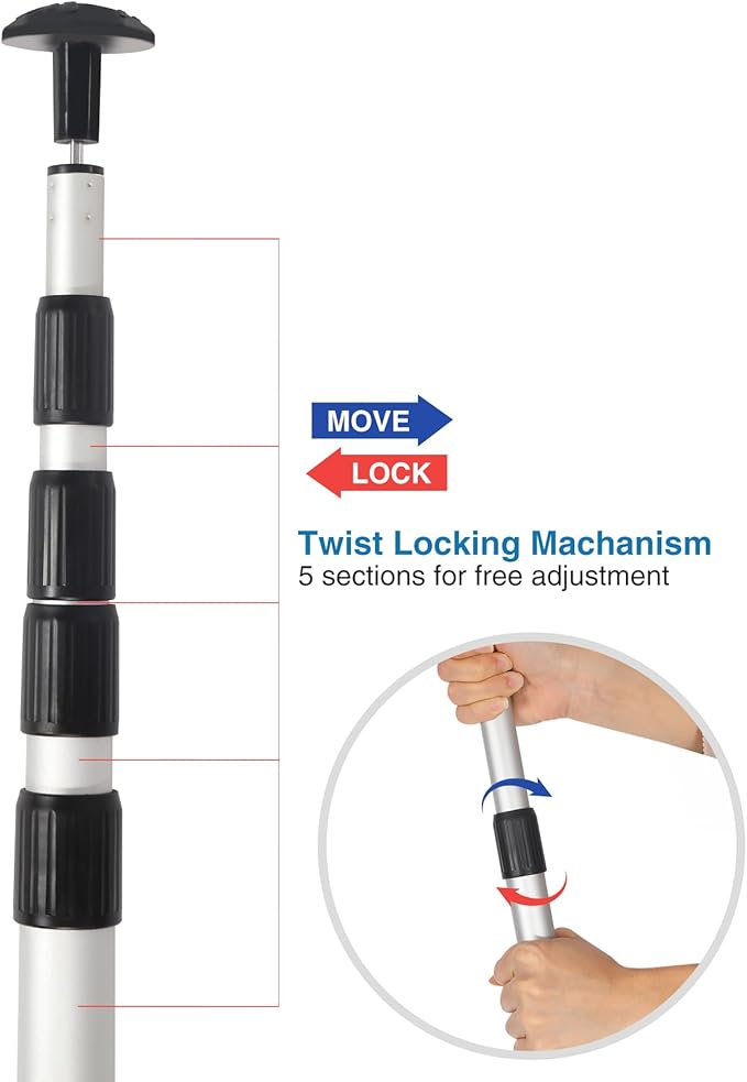 • Twist Lock Mechanism: Simple twist lock system makes it easy to set-up. Just extend it to the proper length and rotate to the right and tighten it. Shrink to the shortest length for easy storage in the included storage bag.