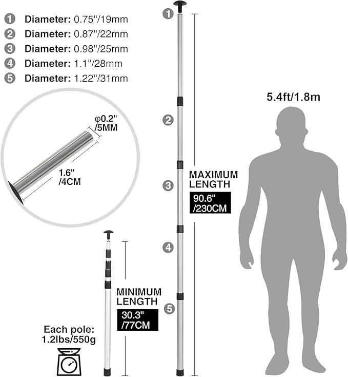 • Uniqueness: Our upgraded aluminum tent pole (total length: 2.3 m β‰ˆ7.55 FT) features a unique spiral structure and 5 adjustable sections that can be retracted together at the same time. (Note: 3-section or 4-section adjustable tent poles are available in our store.)