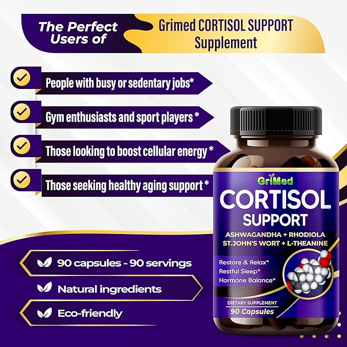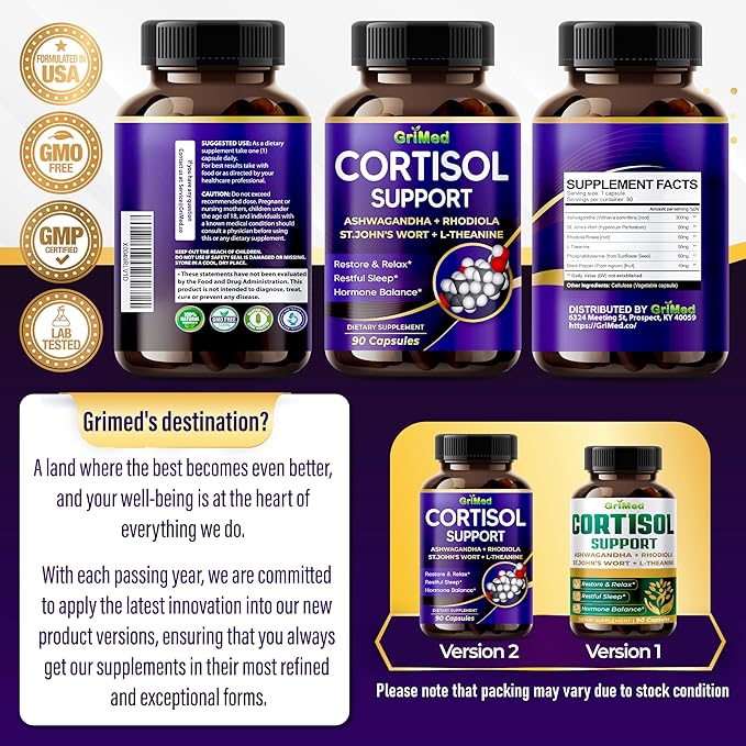 - Unparalleled Benefit: GriMed Cortisol Support offers an extraordinary of raw powder in each serving, aimed at fostering rejuvenation, promoting relaxation, enhancing restful sleep, and assisting in maintaining optimal cortisol levels - a potent hormone released during stressful periods. With 90 capsules per bottle, it ensures a 3-month supply. Regular usage of GriMed Cortisol Support will yield noticeable and impressive results.