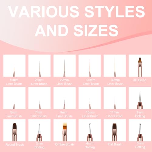 - 【Professional 9PCS Acrylic Brush Set】Come with 5pcs size 5/7/9/10/11/15/20/22/25/30mm double-ended nail liner brushes, 4pcs double-ended dotting pen,contain size 2/3/4/5mm dotting pen, 1 flat brush, 1 round brush, 1 ombre brush, and 1 3D brush. Pefect for drawing different patterns on nail tips.