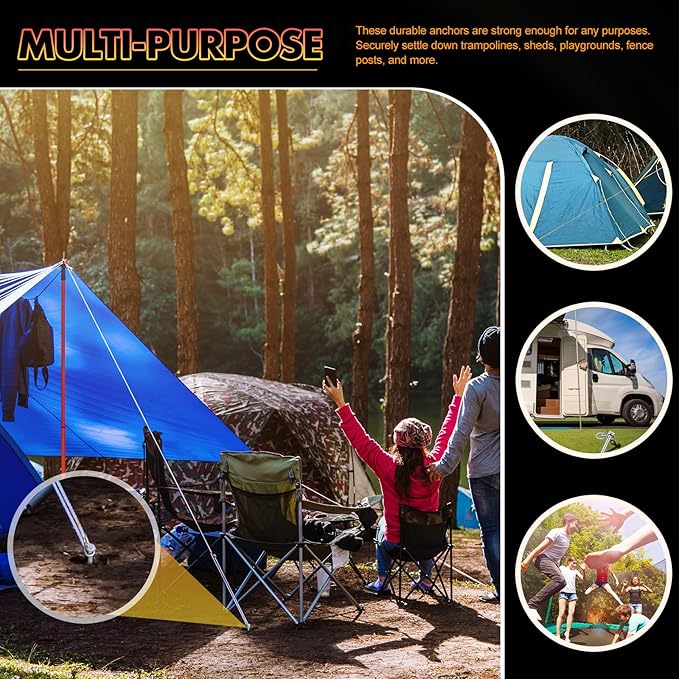 • Wide Range of Applications: these swing set anchors are practical and classical tools, which can be widely applied for camping tents, trampolines, swings, playgrounds, slides, canopies, temporary shelters, automobile ports, sheds, pet rooms, trees, fences and fence posts, vertical hammocks, and more