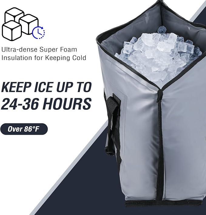 - FISH COOLER: The Insulated Fish Cooler Bags are designed to keep the catch cool and fresh.Tested to keep ice cold for 24-36 hours (in summer) when zipped closed