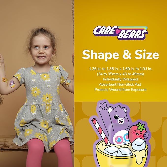 - SAFE PACKAGING: These sterile Care Bears cartoon character bandages come in cute and adorable packaging, and are individually wrapped for safe handling; small bandages help protect kids' sensitive wounds from coming into contact with dirt for first aid wound care