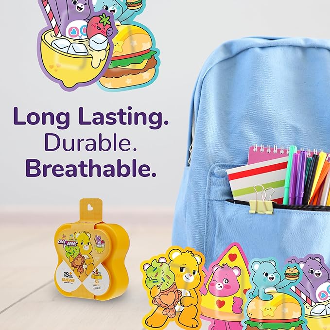 - CARE BEARS BANDAGES: This 50 piece pack of Care Bears bandages feature fun Wish Bear, Funshine Bear, Share Bear, and Cheer Bear shapes, and is great for putting a smile on kids' faces while protecting wounds such as cuts, scrapes, and burns; sticky bandages come in a cute plastic container and are perfect for kids and adults alike, and also for school nurses and pediatric doctors