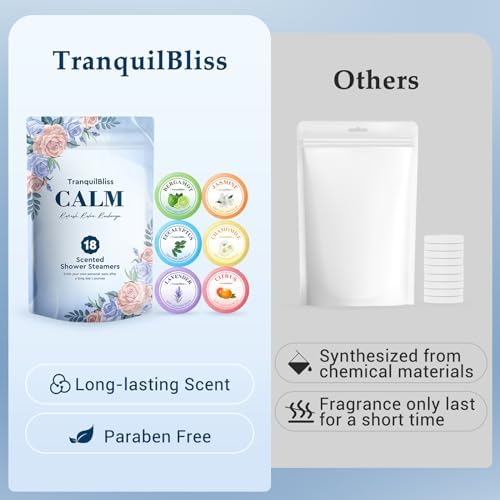 - [Good Idea for Sharing] TranquilBliss shower steamers are designed with exquisite packaging and affordable quantities, and each shower steamer comes in a separate plastic package. These shower tablets can turn any shower into a wonderful experience, with a pleasant aroma. On Christmas, Thanksgiving, Valentine’s Day, Mother’s Day, or birthdays, this is definitely a thoughtful thing to pamper your wife, mother, friends, parents, husband, or children.