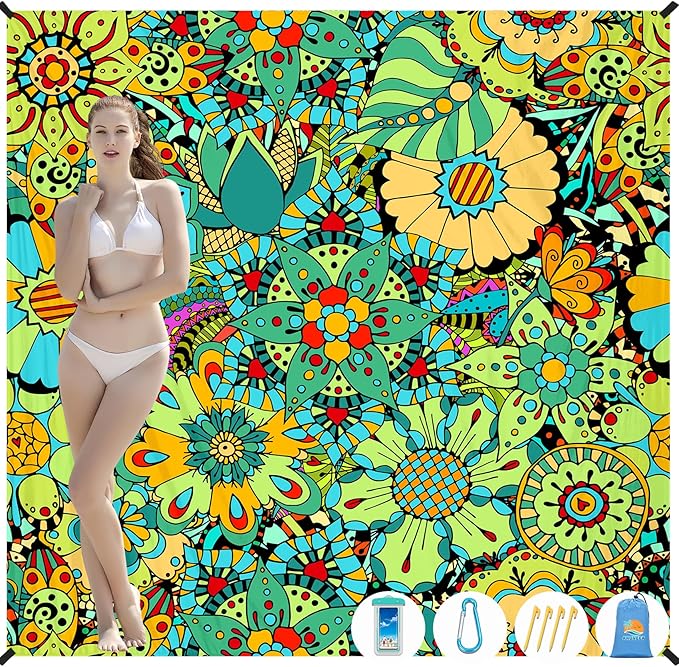 - 🌴BEACH BLANKET WATERPROOF SANDPROOF:78''×81'' size beach blanket is made of parachute fabric,odorless,can be used by 1-7 adults simultaneously.Rip-stop 210T polyester, lightweight and compact after folding.Easy to carry and use.