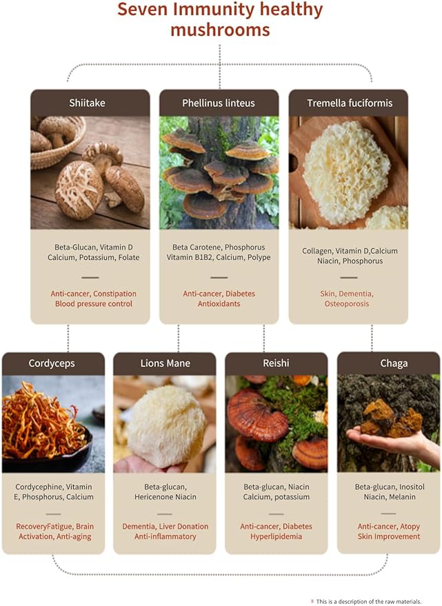 - Good health – Function of seven well-known mushrooms. Experience the Benefits of 7 Most Health Beneficial Mushrooms in One Supplement. Phellinus linteus, Shiitake, Reishi, Chaga to support immune system, and Cordyceps for anti-aging and endurance, and Tremella fuciformis for skin. Trust us to provide you with the best quality mushroom blend for your overall health and wellness.