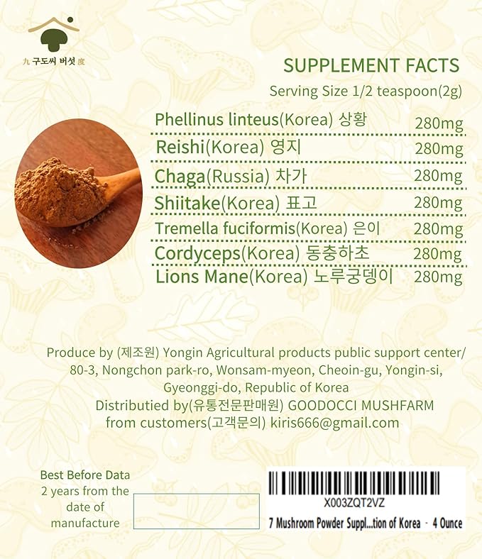- HIGH QUALITY - This product contains nothing but mushrooms, and there are seven kinds of mushrooms in the same amount. Phellinus linteus, Reishi, Chaga, Shiitake, Tremella fuciformis, Cordyceps, Lions Mane, 16.2g each. All mushrooms except Chaga mushroom are produced in Korea.