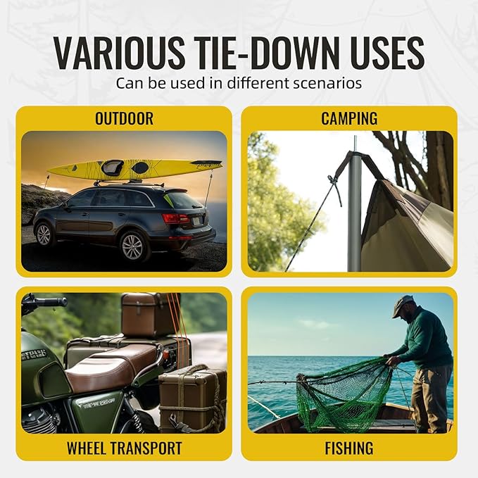 • 【Multi-purpose】The guide rope is ideal for different uses (zipper pullcord, carry bag pullcord, hammock rope, tent rope, clothesline, hanging pants,kayak and canoe,replacement cords for your gear etc), ratchet rope is perfect for outdoor camping, hiking, backpacking, tarps, and rain tarp